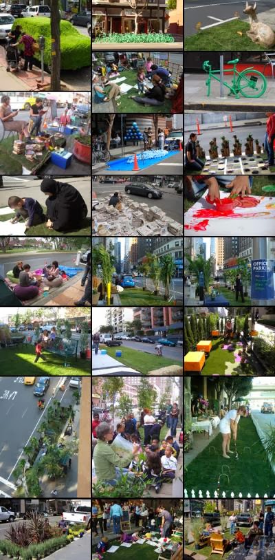 Park(ing) Day es una celebración anual y global en la que artistas, diseñadores y ciudadanos comunes colaboran para transformar temporalmente (por un día) estacionamientos con parquímetro en áreas verdes públicas temporales.