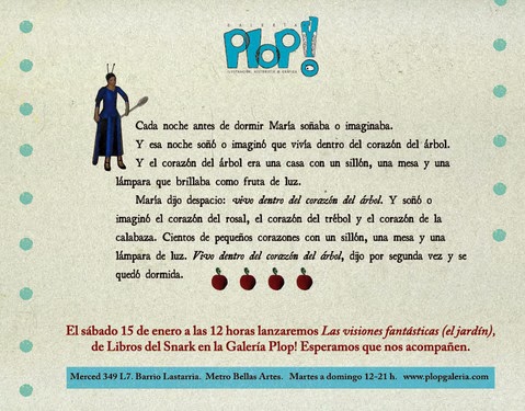 Libros del Snark lanzará su segundo libro titulado "las visiones fantásticas (el jardín)", el próximo sábado 15 de enero al mediodía. El acontecimiento tendrá lugar en la galería PLOP!, Merced 349 local 7.